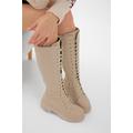Kadın Bej Kalın Poli Taban Bağcıklı ve Fermuarlı Diz Altı Çizme