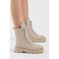 Kadın Krem Cilt Kalın Taban Nakışlı Bağcıklı ve Fermuarlı Bot